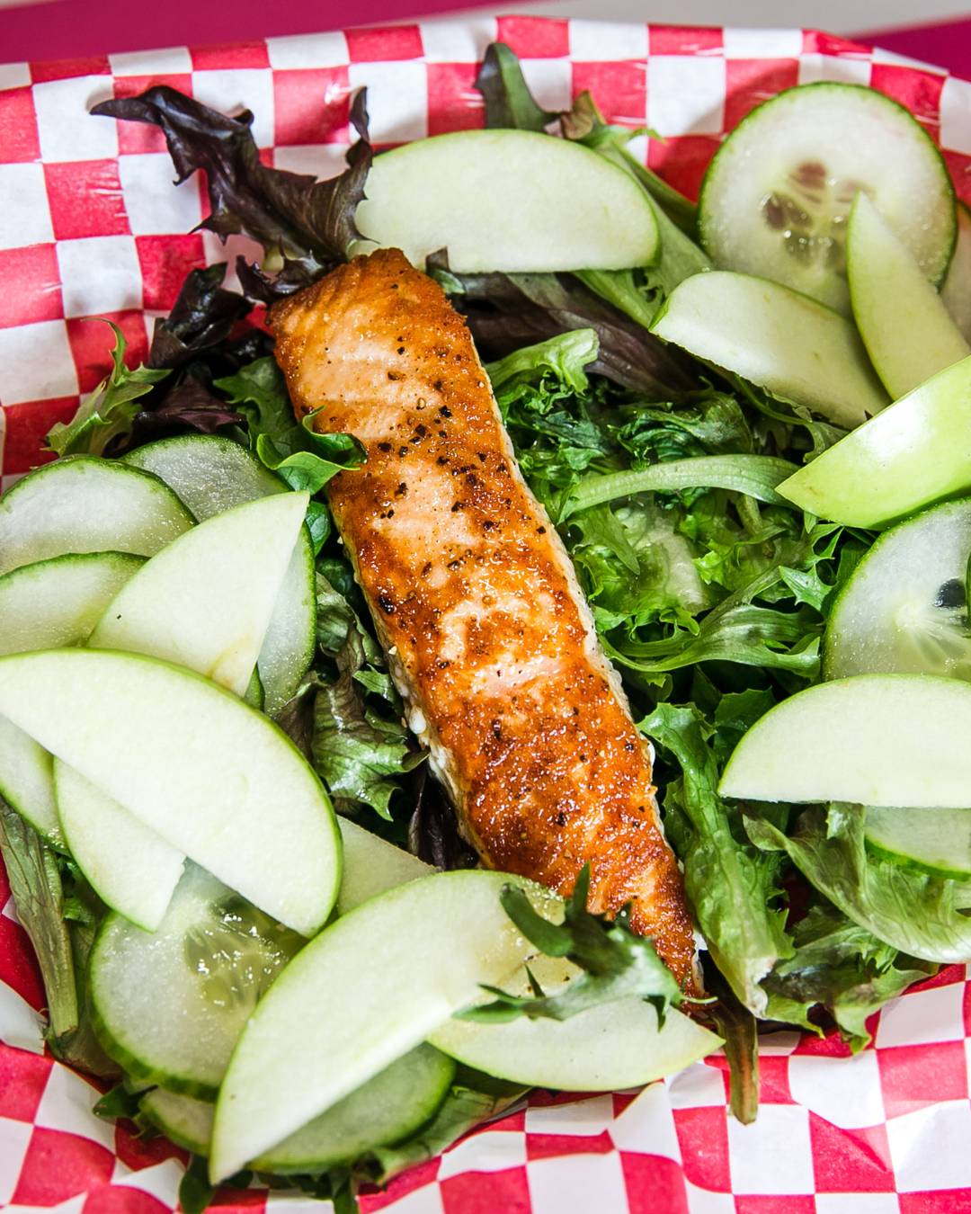 fresh salmon fillet* seared on the grill served over organic field greens, with cucumbers & lemon vinaigrette dressing